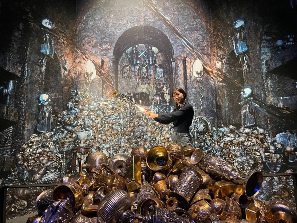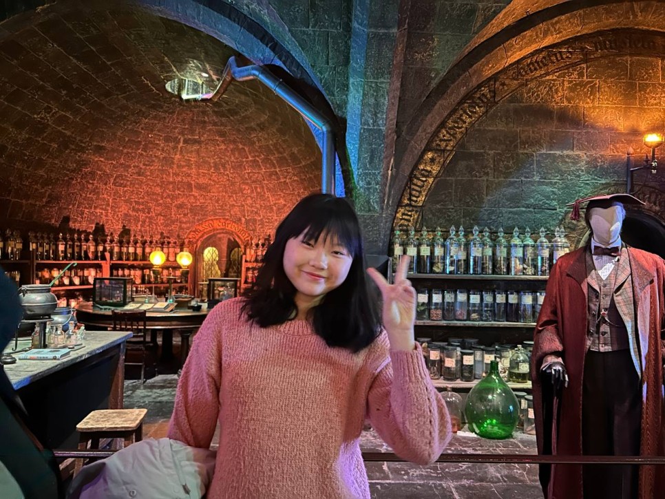 호그와트로 가는 마법 기차 앞에서 사진도 찍고 마법 상점 거리인 다이애건 앨리 앞에서도 사진을 찍었습니다. 마법 지팡이가 가득한 기념품샵에서 여러 지팡이들을 손에 쥐어보며 가장 마음에 드는 지팡이도 구매합니다.
