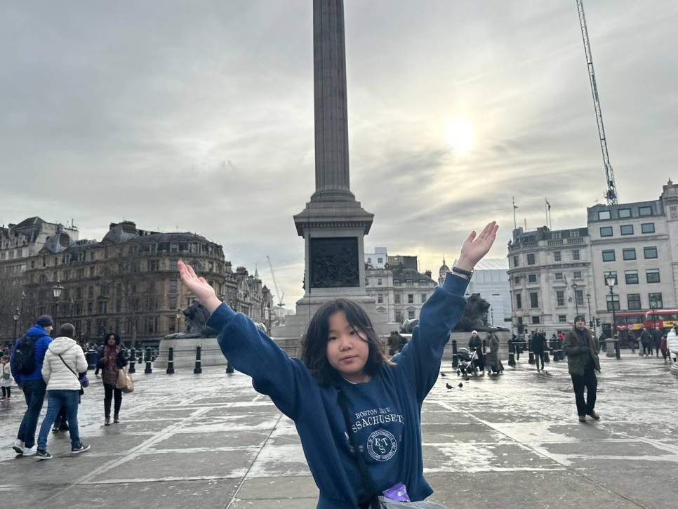 오늘 첫 방문지는 런던의 심장, 트라팔가 광장입니다. 주말이라 사람이 정말 많았고 주변에 버스킹공연을 하는 사람도 있었습니다. 감미로운 버스킹을 들으며 런던의 감성을 200% 즐기는 아이들입니다.