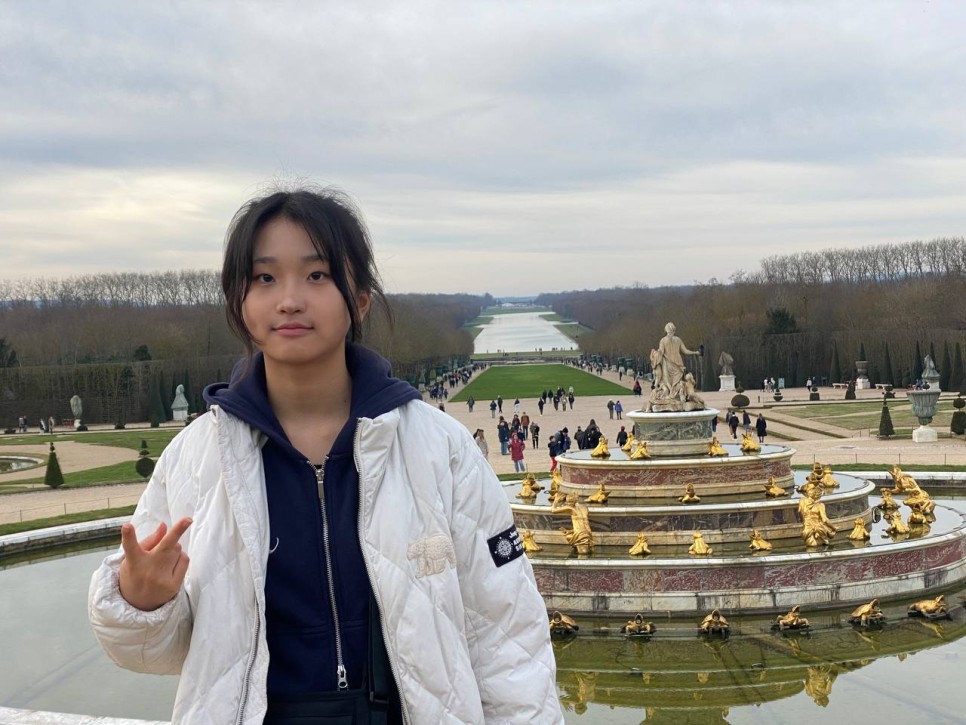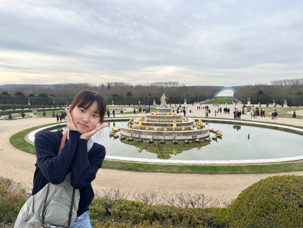 베르사유 궁전을 나오면 뒷편에 드넓은 공원이 자리잡고 있는데요. 날이 좋아 그런지 궁전에도 사람들이 붐비네요. 풀과 나무의 초록빛과 중간에 놓여진 분수, 물의 조화가 아름답습니다. 파리의 풍경을 마지막으로 담으며 카메라셔터를 연신 눌러대는 우리 아이들입니다.