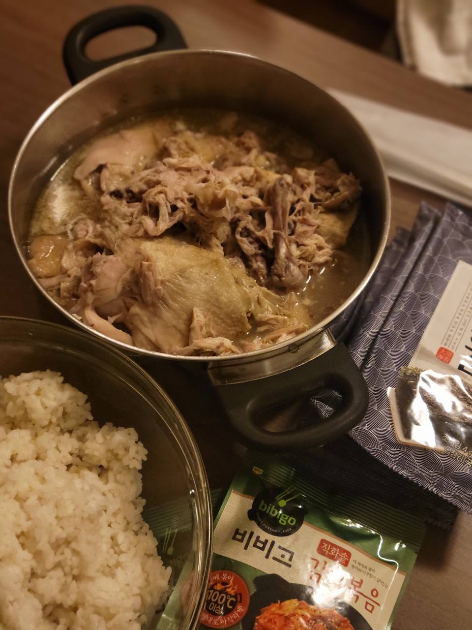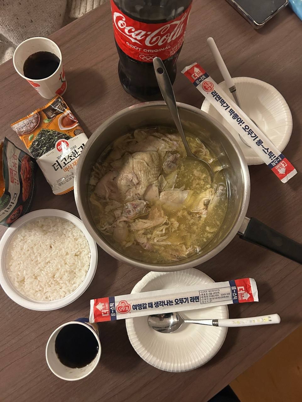 이삿날 저녁식사는 특별한 식사가 준비되었습니다. 여행하며 체력이 떨어진 참가자들을 위한 뜨끈한 삼계탕입니다. 다들 삼계탕을 어떻게 준비했냐며, 70년된 전통 맛집같다고 한그릇 두그릇을 뚝딱 먹습니다.
