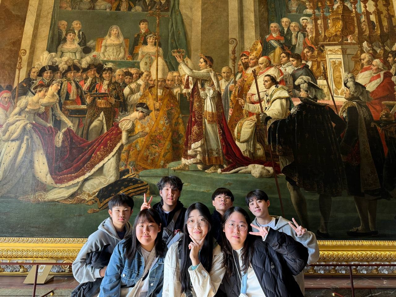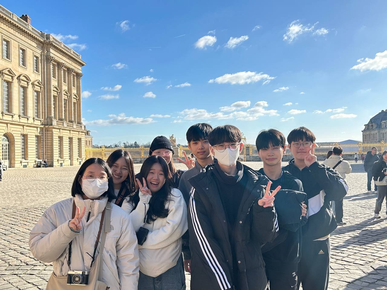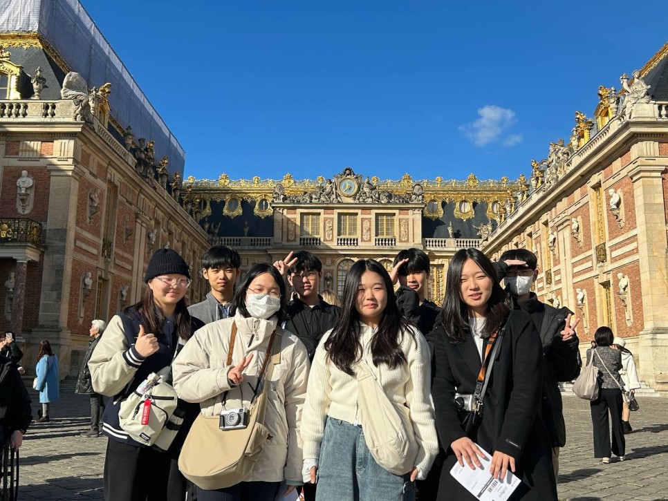 오늘은 날씨가 정말 화창하고 좋았습니다! 아이들이 파리에 온 것을 환영해주는 것 같았습니다. 따스한 햇살에 눈이 부셔서 눈을 뜨기가 힘들정도였어요. 인생에 한번뿐인 인생샷을 남겨야한다는 사명감에 우리 모두 눈을 부릅떠보면서 사진을 찍어보았습니다. 화려하게 금칠된 정문을 지나 내부의 수많은 방들을 둘러보았습니다. 거울의 방에 들어섰을 때 거울보다도 눈에 띄는 것은 샹들리에들이었습니다. 겨울인데도 날이 좋아 정원 사진도 참 예쁘게 잘 찍혔습니다.