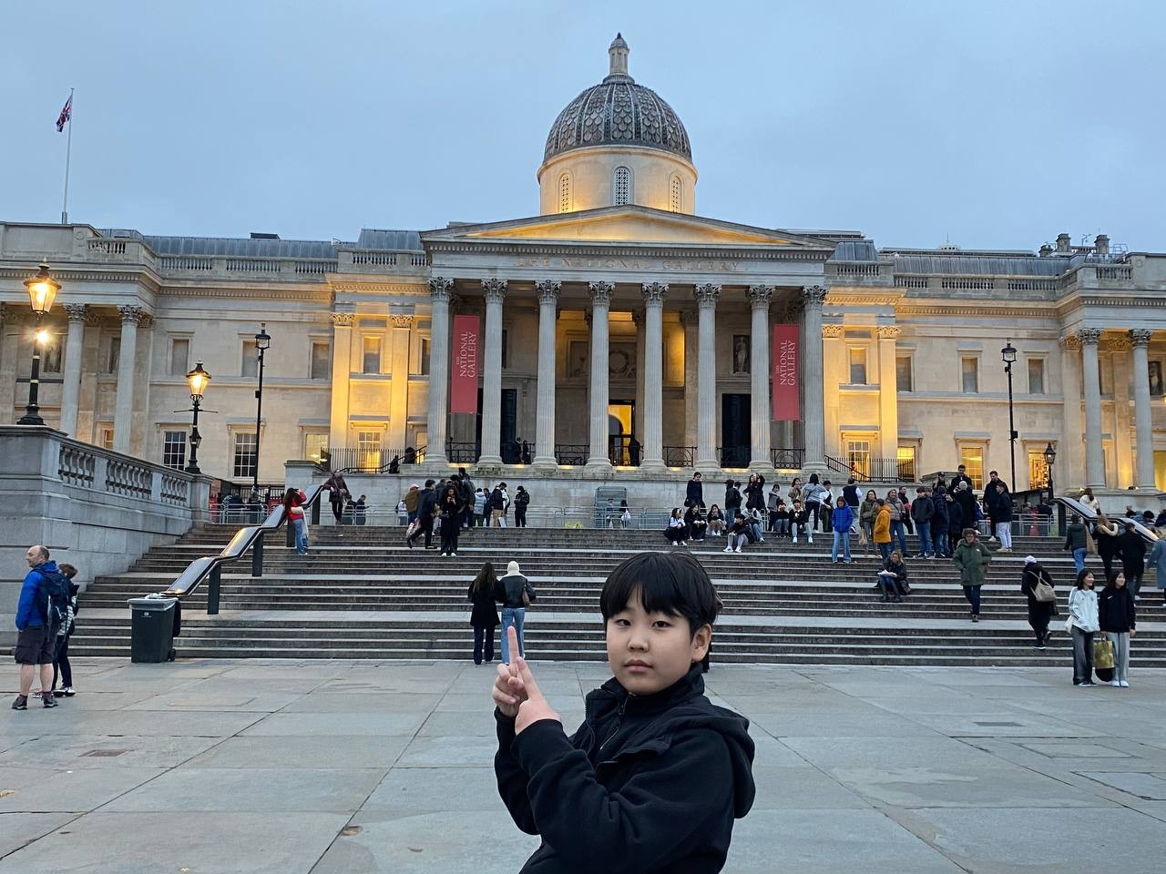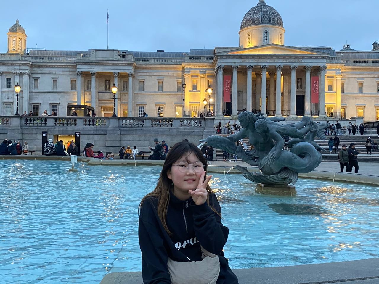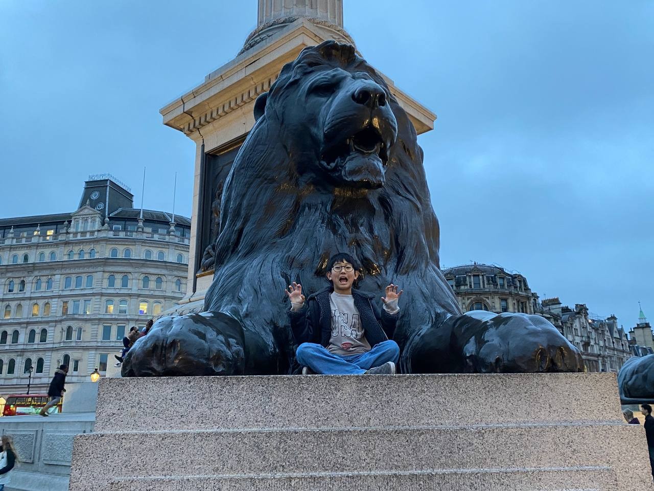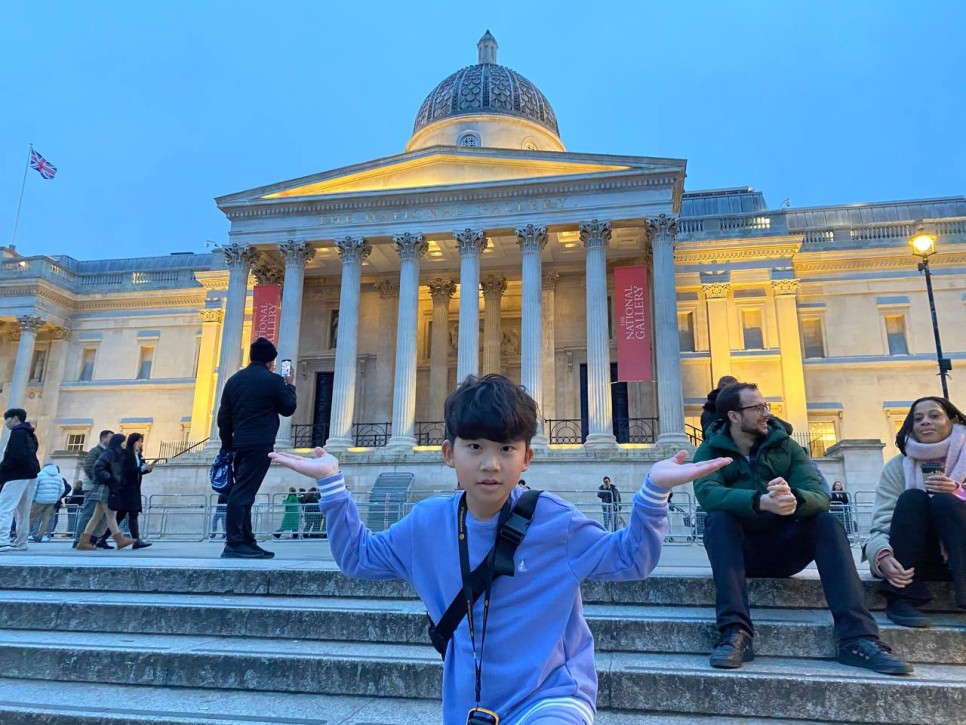 내셔널 갤러리를 나오니 확 트인 트라팔가 광장이 아이들을 맞이합니다. 우리가 나온 시간대는 해가 지는 때와 맞아 떨어져 주변 조명이 너무 아름다웠습니다. 아이들과 함께 광장에 있는 분수대, 내셔널갤러리를 배경으로 멋지게 사진도 찍었습니다.