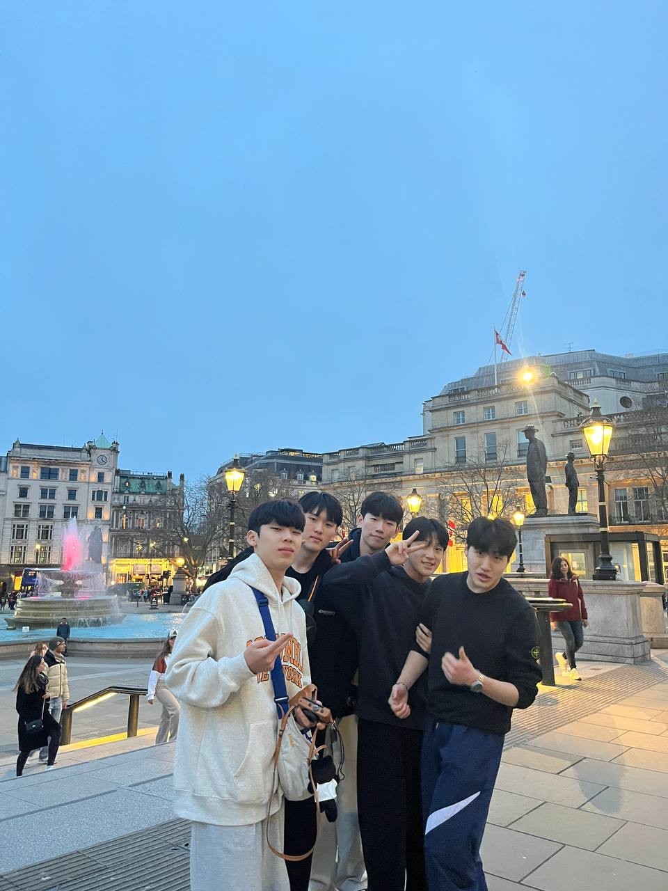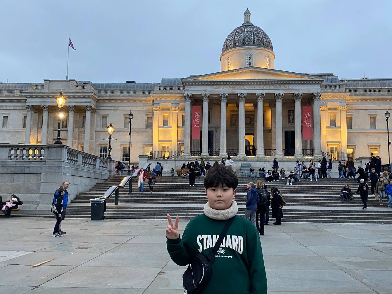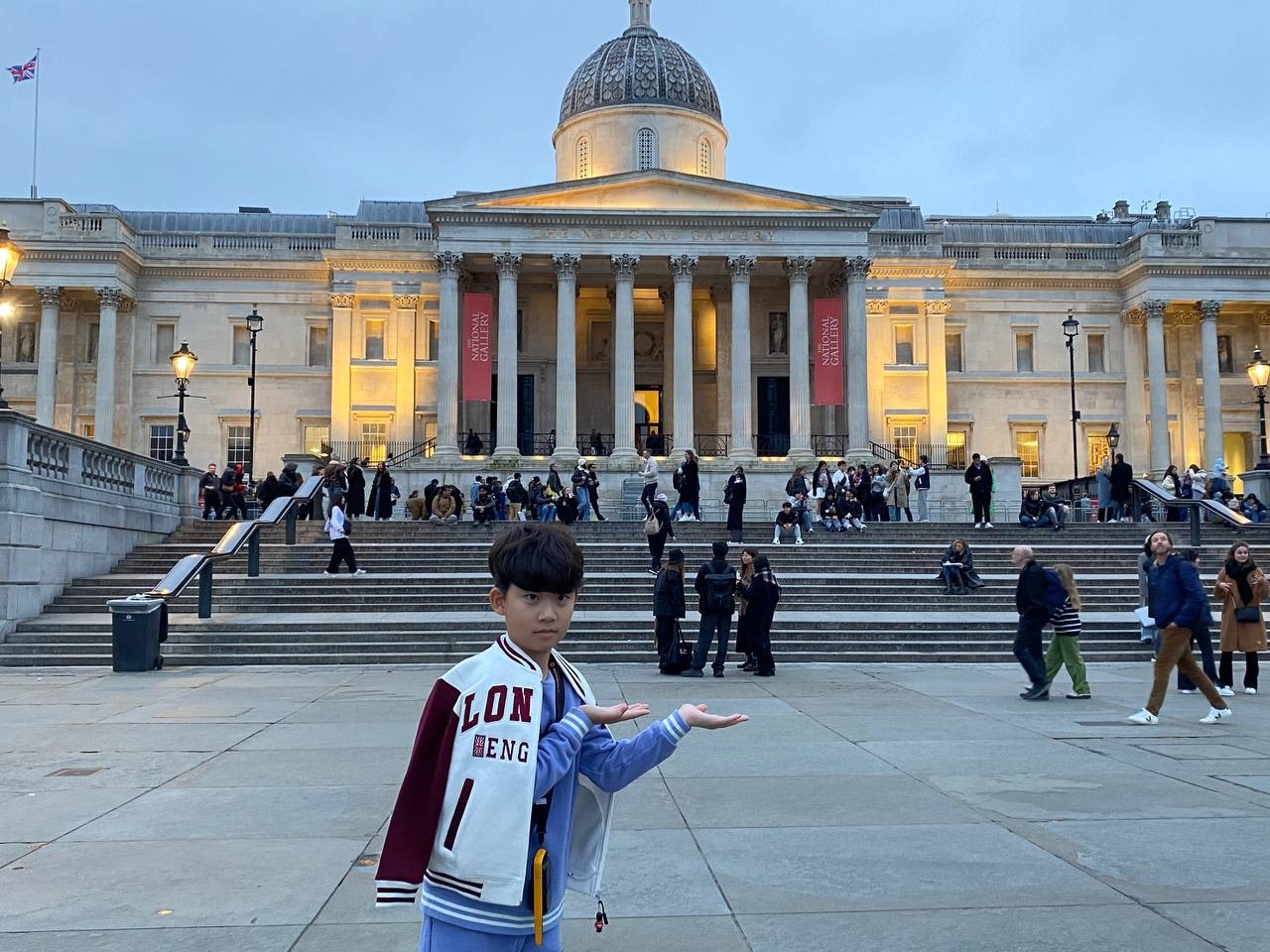 내셔널 갤러리를 나오니 확 트인 트라팔가 광장이 아이들을 맞이합니다. 우리가 나온 시간대는 해가 지는 때와 맞아 떨어져 주변 조명이 너무 아름다웠습니다. 아이들과 함께 광장에 있는 분수대, 내셔널갤러리를 배경으로 멋지게 사진도 찍었습니다.
