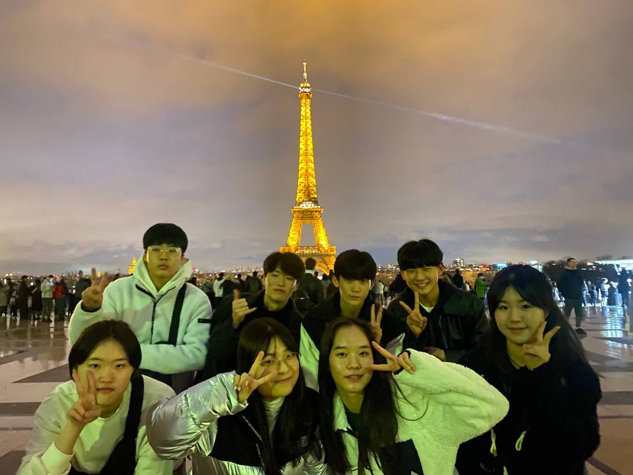 마지막 일정으로 저녁 외식을 한 뒤 에펠탑으로 이동했습니다. 가는 길부터 파리 시내에 우뚝 솟은 에펠탑이 불빛을 비추며 우리를 반기고 있었습니다. 직접 본 에펠탑은 더욱 크고 웅장했습니다. 정시에 맞춰 수천 개의 전구가 반짝이는 에펠탑은 정말 아름다웠습니다.