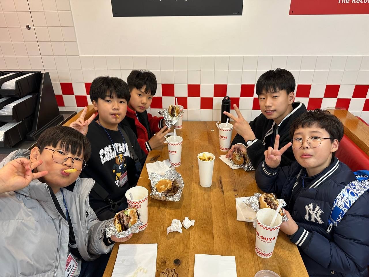 런던 일정의 하이라이트인 야경을 보기 전에 저녁 외식을 했습니다. 한국에서는 먹어보기 힘든 파이브가이즈 햄버거를 먹었습니다. 햄버거를 빠르게 다 먹은 아이들은 게시판에 영어 문구를 남기며 흔적을 남기고 갑니다.