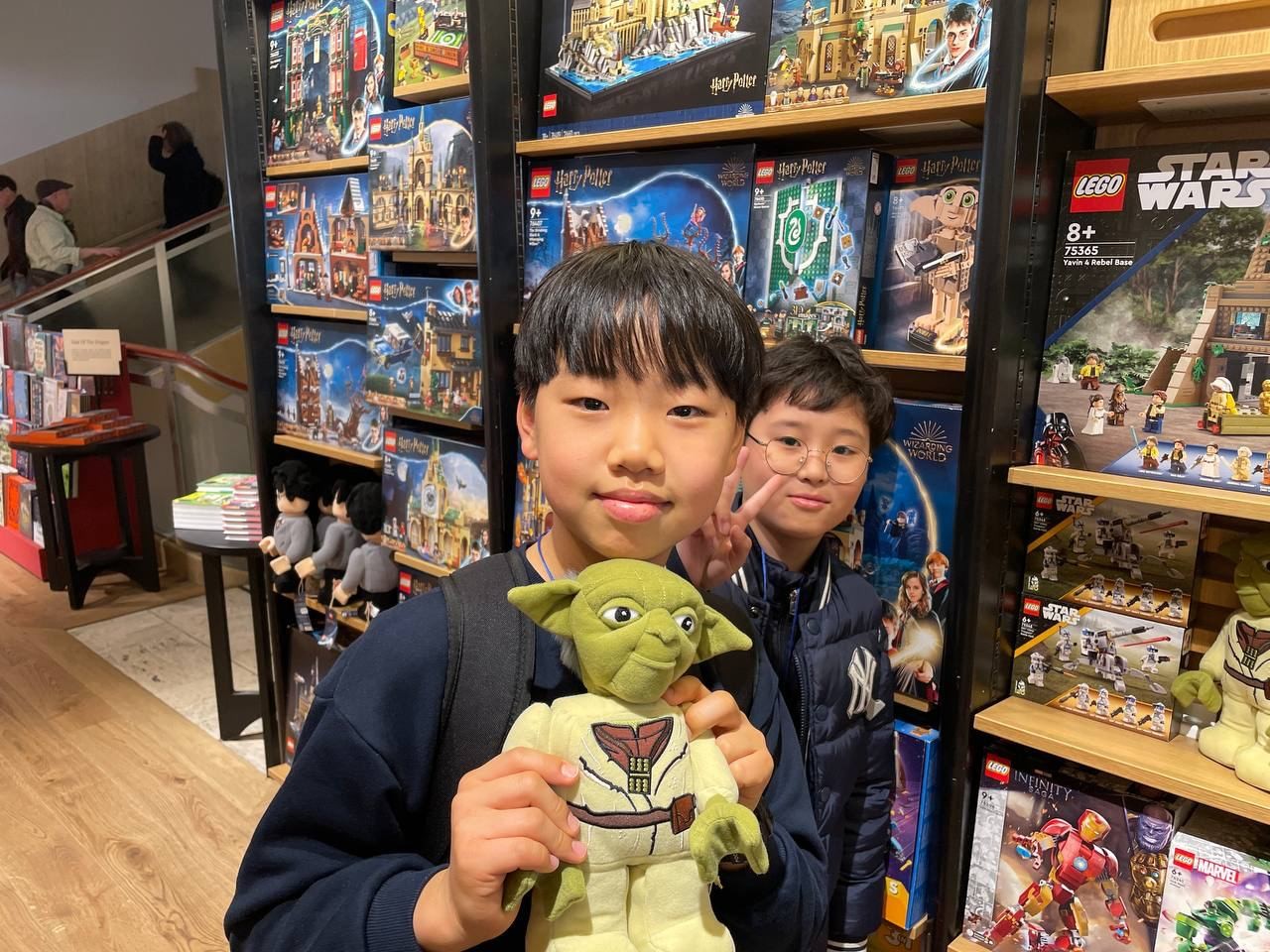 첫번째 일정은 워터스톤즈 서점이었습니다. 아이들을 위한 공간인 2층에 들어서자마자 아이들이 정말 좋아했습니다. 패딩턴과 젤리캣 인형을 들어보이며 사진을 찍기도 하고, 다양한 디자인의 레고를 구경하기도 합니다. 해리포터 코너에 모여든 아이들은 영화에서 보던 해리포터의 공책을 보고 신기해하기도 했습니다.