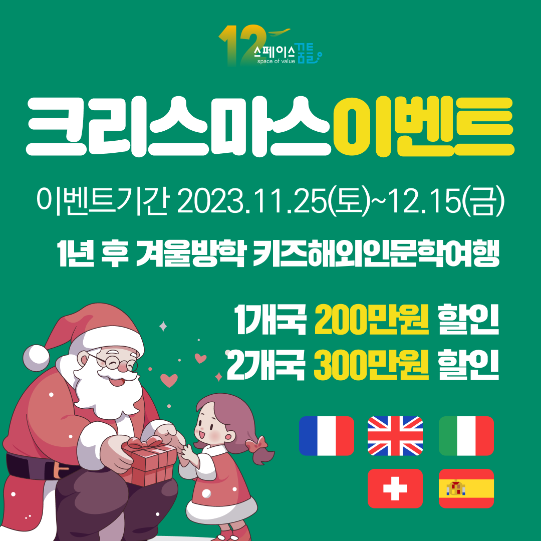 | [크리스마스 이벤트] 1년 후 유럽여행 200만원 특별할인 (~12.15) [스페이스꿈틀] (1) | 2023.11.28 |