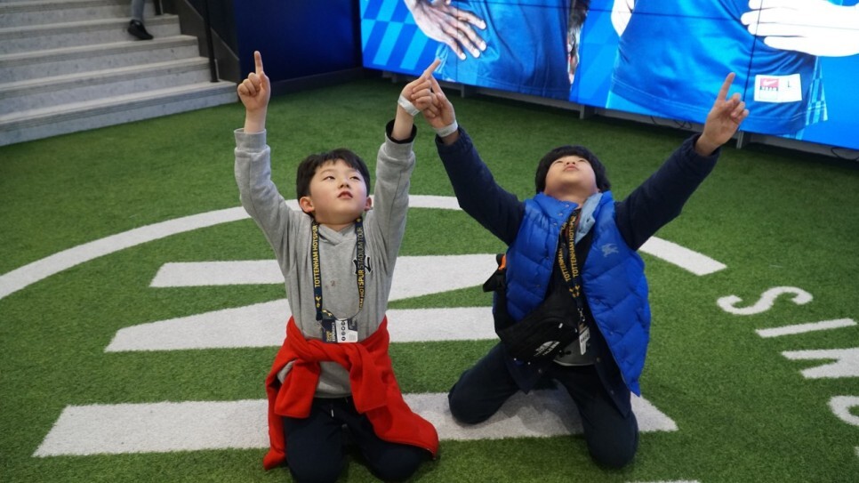 선수들이 뛰는 넓은 피치를 보고는 다들 '우와~' 감탄했습니다. 커다란 경기장에 와있으니 덩달아 들뜨는 기분이었습니다. 세레머니 하는 선수처럼 포즈도 취해보고 신나는 시간을 보냈습니다.