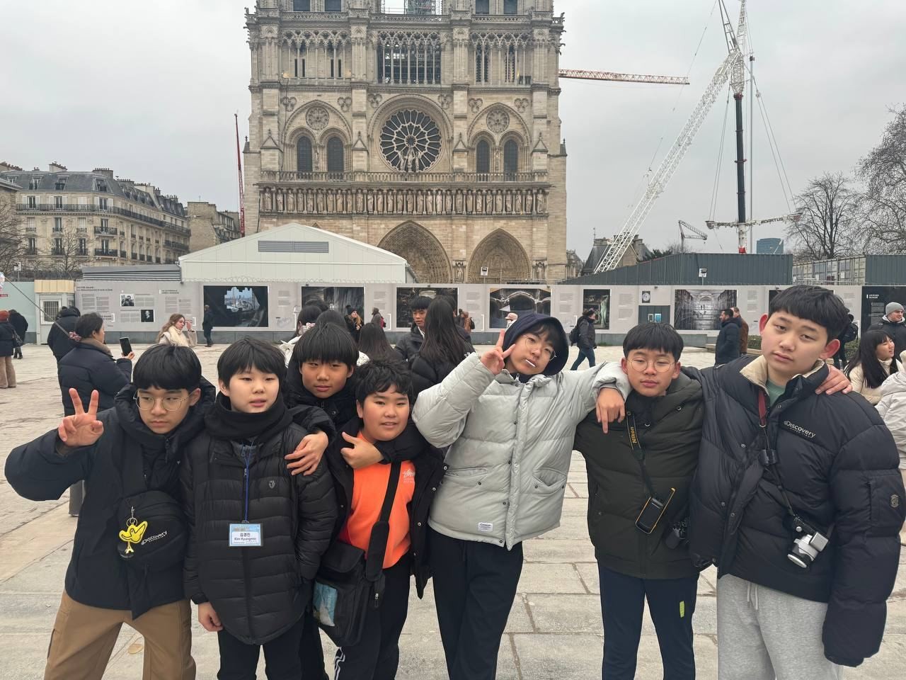 판테온과 소르본 대학가를 지나 생미셸 광장에 도착해 아이들이 기다리던 자유시간을 가집니다. 케밥과 아이스크림을 사 먹고 가족들에게 줄 기념품을 양손 한가득 들고 옵니다. 즐거웠던 자유시간을 마치고 웅장한 모습을 간직한 노트르담 대성당으로 향했습니다. 노트르담 드 파리로 유명한 노트르담 대성당 앞에서 기념사진도 남겼습니다.