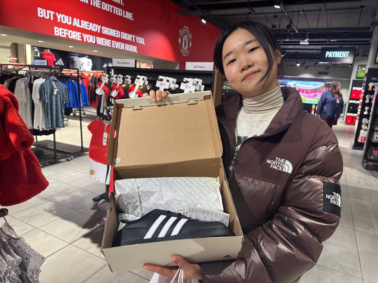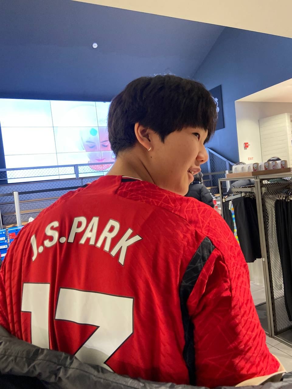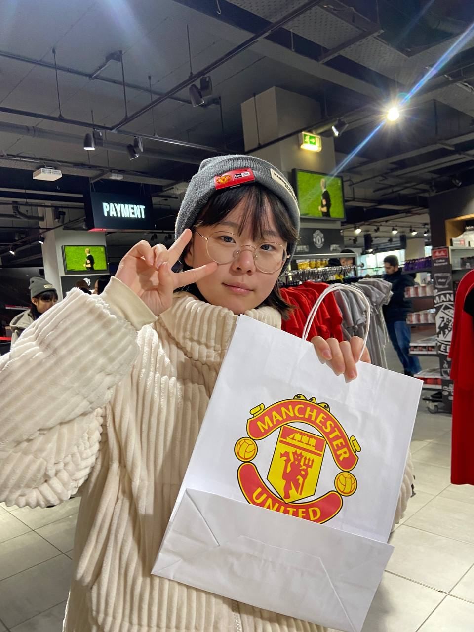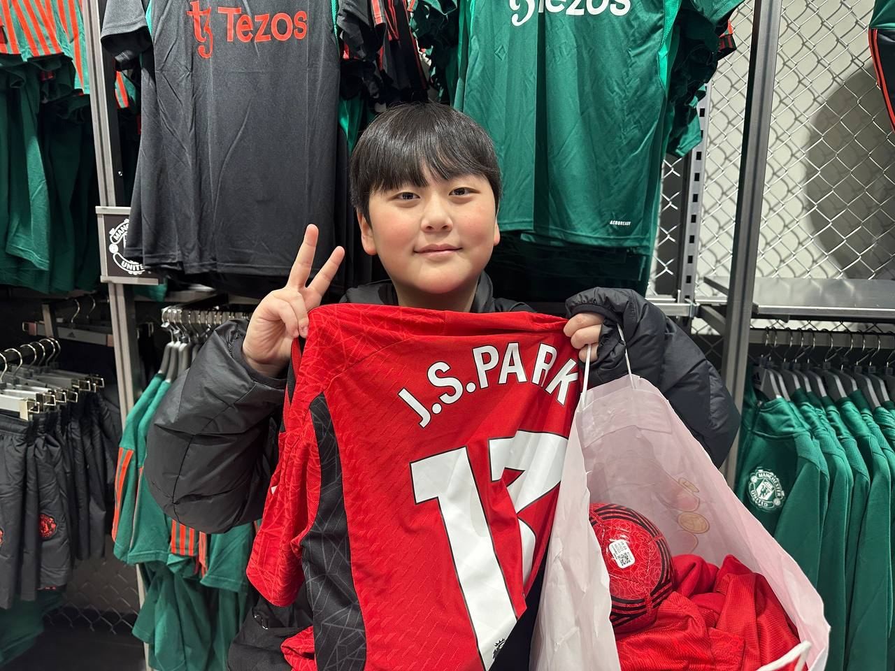 맨체스터 유나이티드 메가스토어에 방문했습니다. 박지성선수가 뛰었던 맨체스터유나이티드! 아이들은 자랑스러운 박지성 선수의 등번호를 직접 프린팅해 남겼습니다. 프린팅한 티셔츠를 장만한 남학생들은 보다 적극적으로 나서 포즈를 취합니다.